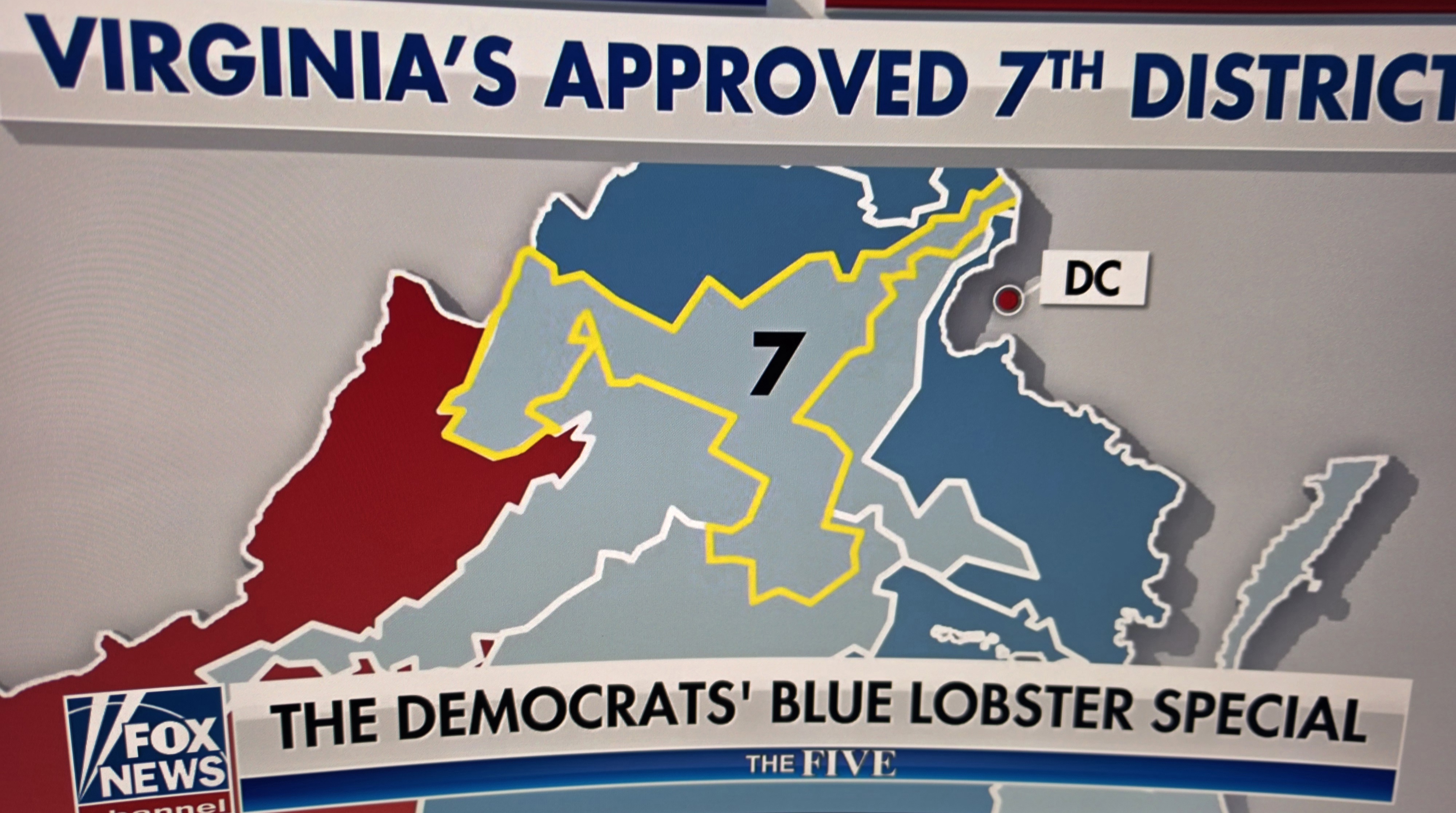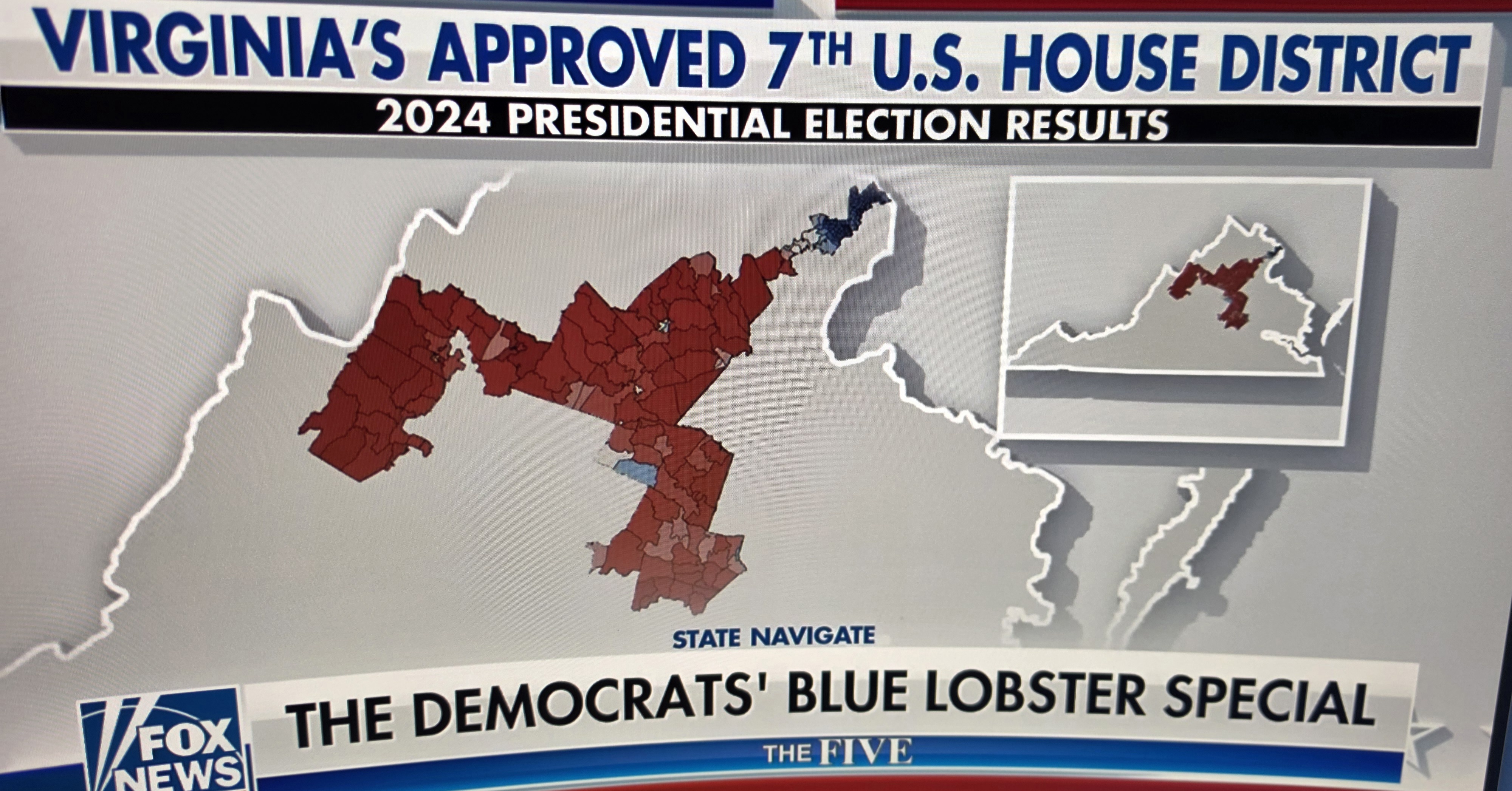 The second image from The Five makes the strategy brutally clear: when you overlay the 2024 presidential results on the new 7th District, the lobster claws sweep through deeply red rural Virginia — Shenandoah Valley farming communities that voted overwhelmingly Republican. The design isn’t accidental. The shape exists specifically to dilute those Republican votes by attaching them to the deep-blue Northern Virginia tail, where they are arithmetically overwhelmed.